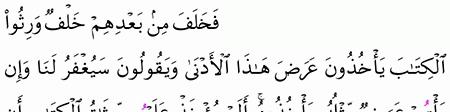 ف خ ل ف م ن ب ع د ه م خ ل ف و ر ث وا ال ك ت اب ي أ خ ذ ون ع ر ض ه ذ ا ال أ د ن ى و ي ق ول ون س ي غ ف ر ل ن ا و إ ن ي أ ت ه م ع ر ض م ث ل ه ي أ خ ذ وه أ ل م ي ؤ خ ذ ع ل ي ه م م يث اق ال ك ت اب أ ن ل ا ي ق ول وا ع ل ى الل ه إ ل ا
