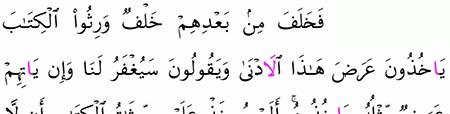 ف خ ل ف م ن ب ع د ه م خ ل ف و ر ث وا ال ك ت اب ي أ خ ذ ون ع ر ض ه ذ ا ال أ د ن ى و ي ق ول ون س ي غ ف ر ل ن ا و إ ن ي أ ت ه م ع ر ض م ث ل ه ي أ خ ذ وه أ ل م ي ؤ خ ذ ع ل ي ه م م يث اق ال ك ت اب أ ن ل ا ي ق ول وا ع ل ى الل ه إ ل ا