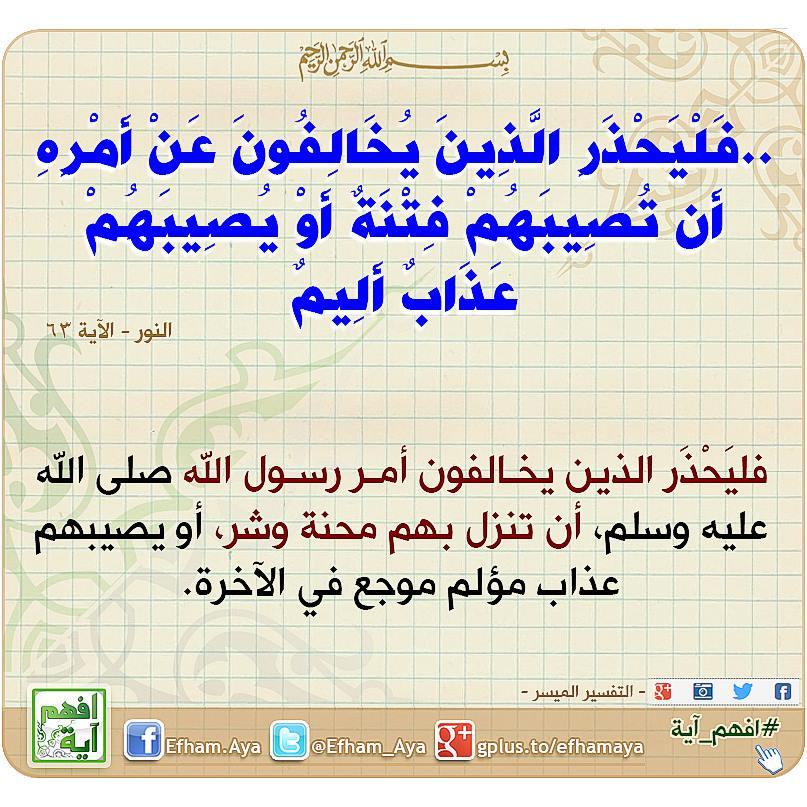 افهم آية V Twitter فليحذر الذين يخالفون عن أمره أن تصيبهم فتنة أو يصيبهم عذاب أليم افهم آية قرآن تدبر تفسير Http T Co Hai3ykn9ee