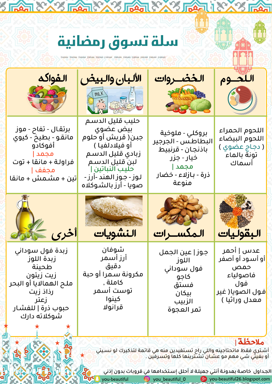 قائمة تسوق صحية لشهر رمضان. قائمة تسوق صحية لشهر رمضان. ان الهدف من استعراض القائمة التالية هو ان نركز على ان قائمة المشتريات والتسوق للبيت يجب ان ترتكز على العناصر التالية بحيث تشكل النسبة الاكبر من المشتروات 90 وتبقى بعض. قائمة مشتريات رمضان الصحية وكل ما يجب شراؤه 6 مايو 2020 دقيقتان قراءة شارك على فيسبوك كل يوم معلومة طبية شارك على تويتر كل يوم معلومة طبية. شهر رمضان هو شهر الكرم والخيرات ففيه تكثر الأطباق وتكتظ الموائد وتزيد الولائم ولكن علينا أن لا نسرف في هذا الشهر فقد يكون رمضان فرصة ذهبية لاتباع عادات غذائية صحية لتستمر عليها حتى بعد رمضان.