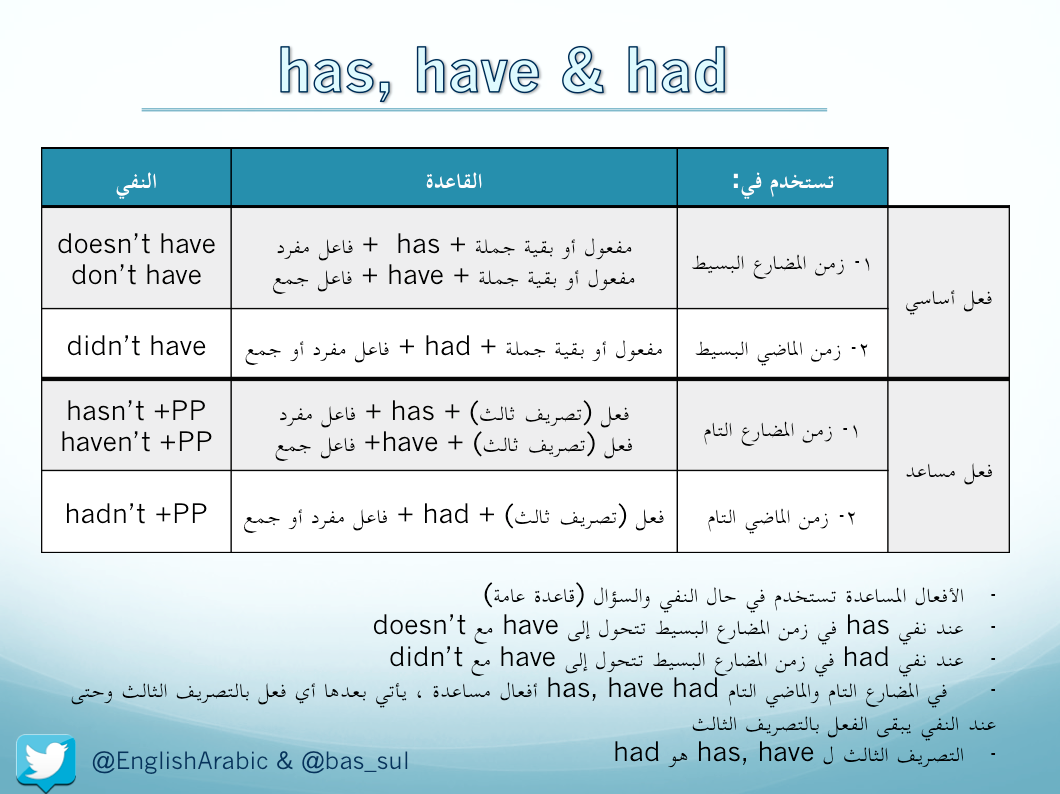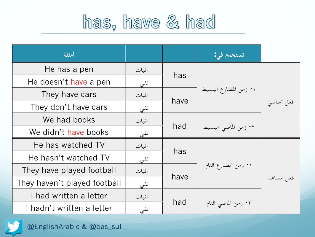 تعل م الإنجليزية معنا Pa Twitter شرح لـ Has Have Had عندما تأتي كفعل أساسي وكفعل مساعد Http T Co Isfs8z6v4q
