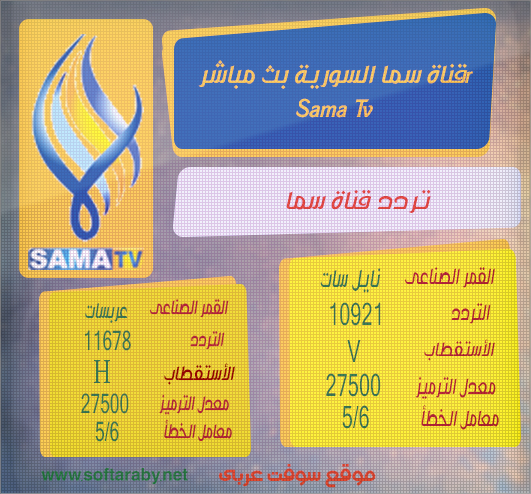 قناة سما الفضائية هي قناة سورية منوعة انطلقت في بث تجريبي مساء الجمعة 7 أيلول 2012 كبديل عن قناة الدنيا التي تم وقف بثها نهائيا عن النايل سات وانطلقت في بثها النظامي صباح الأول من تشرين. تردد قناة سما السورية نايلسات 11177 5 6 v 27500. تسجيل 45 إصابة بفيروس كورونا وشفاء 39 حالة ووفاة 3. ترددات قناة سما الفضائية.